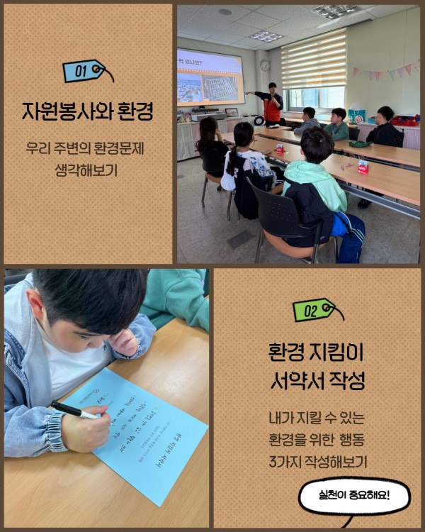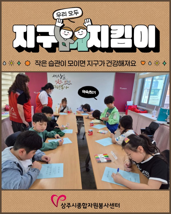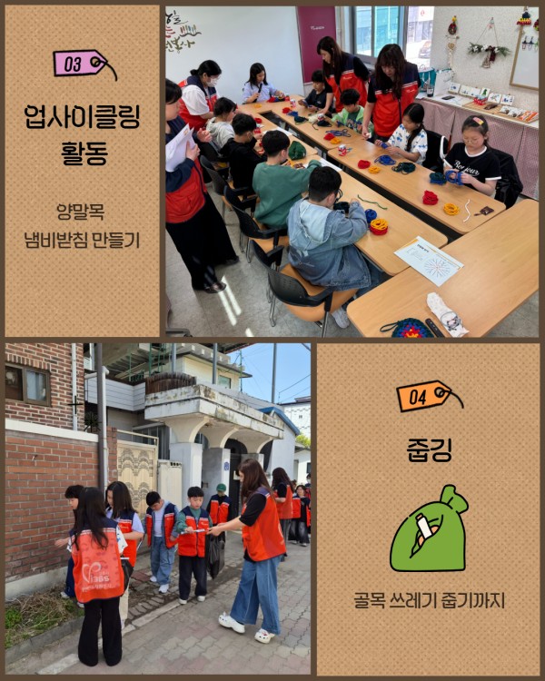 환경에 대해 이야기를 나누고 서약서 작성을 통해 우리가 지킬 수 있는 환경에 대해 고민하는 시간을 가지고 양말목을 활용한 냄비받침 만들기, 줍깅 활동을 통해 다양한 자원봉사활동을 경험하는 기회도 가졌습니다.